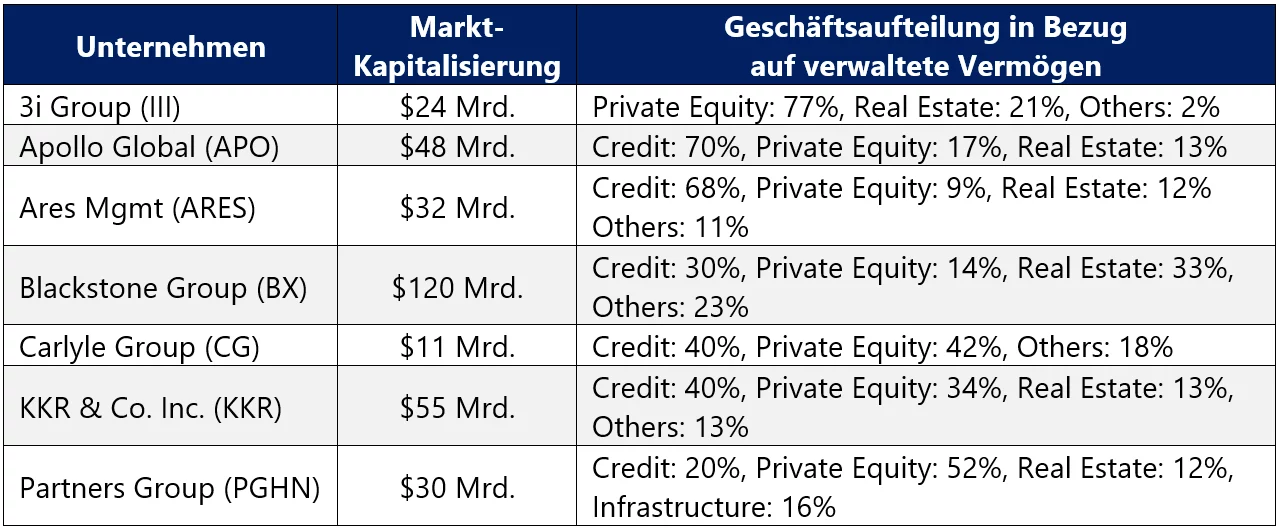 Es handelt sich um das alternative Investment-Management oder die Privatkapitalbranche. Ein Segment, das in den letzten Jahrzehnten stark gewachsen ist, inklusive einer Schweizer Perle namens Partners Group, die mit von der Partie ist. Dabei handelt es um spezialisierte Akteure, die sich auf Private Equity, Kredite, Immobilien und Infrastrukturgeschäfte konzentrieren.