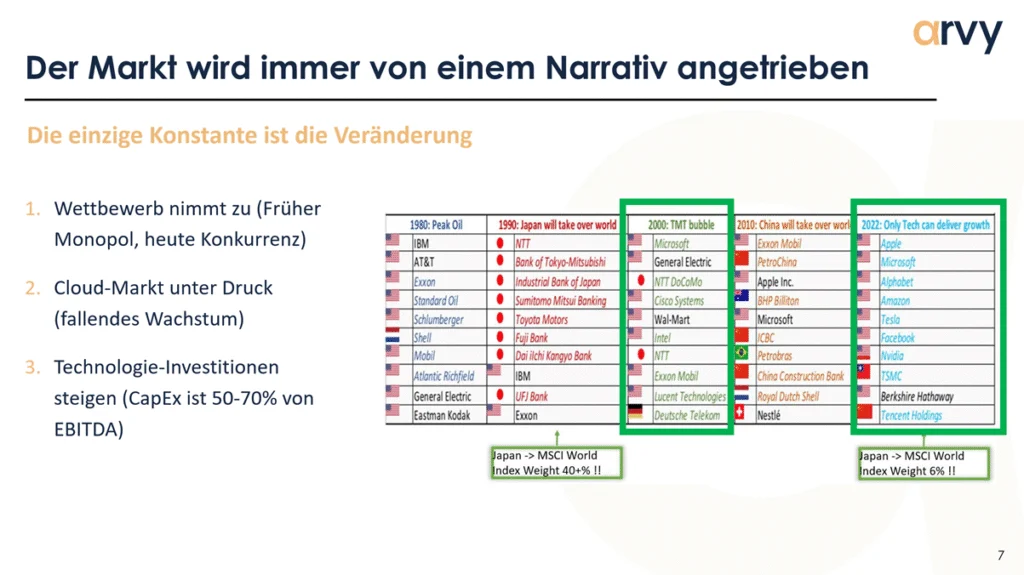 Die momentane Marktdynamik erinnert an historische Phasen der Übertreibung. Schon in den 1970er-Jahren („Nifty Fifty“), zur Dotcom-Zeit oder im japanischen Boom der 1990er-Jahre zeigte sich: Extreme Konzentrationen und hohe Bewertungen gehen langfristig selten gut aus.