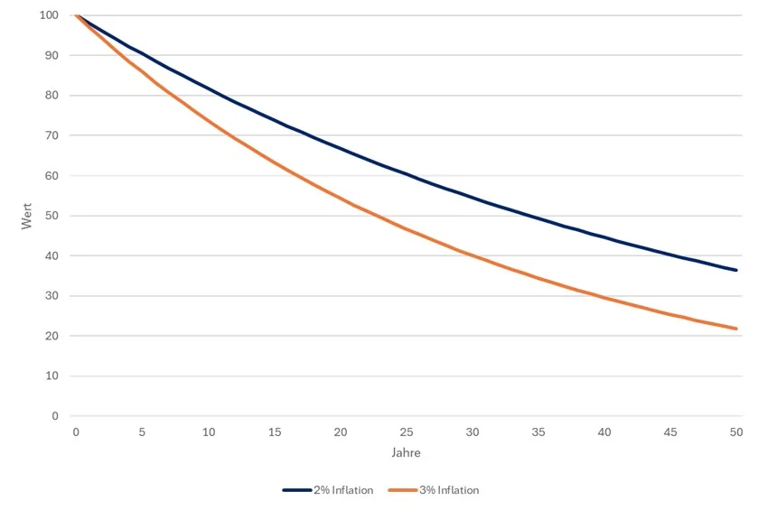 Inflation is a silent killer. At just 2% per year, your CHF 100 today is worth CHF 54 in 30 years and CHF 36 in 50 years. Do nothing, and you guarantee loss. Investing is the only way to fight back.
