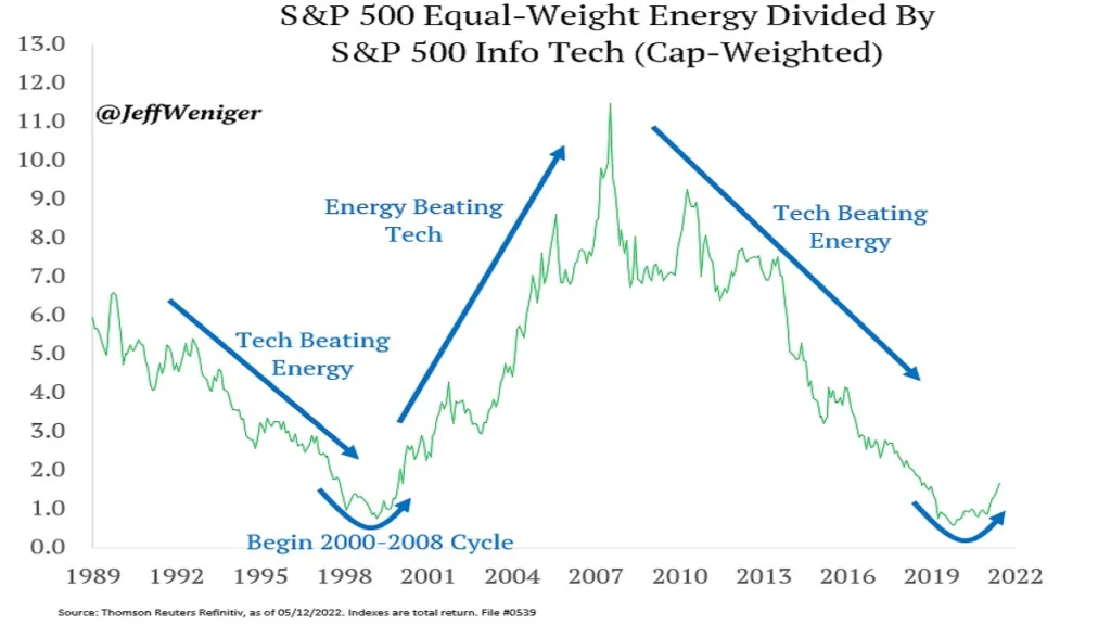 In short: It is because energy and technology stocks cannot move in lockstep. They are inversely correlated. Every time the former does well, the latter suffers. And vice versa.