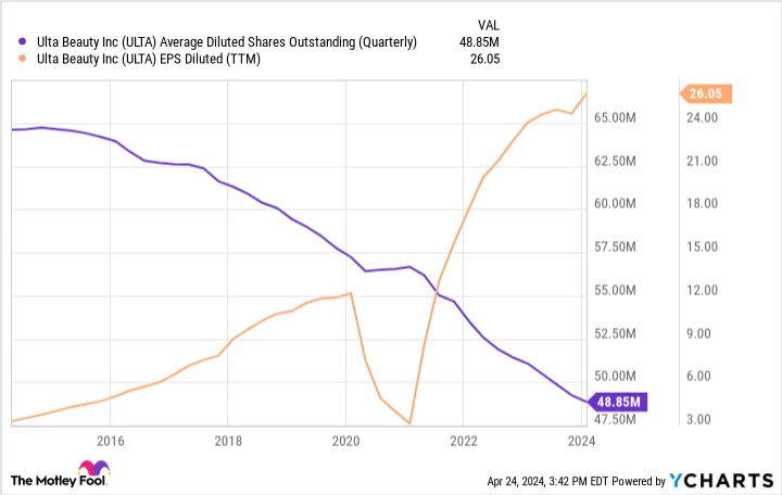 But while you may experience a rollercoaster ride with the stock from time to time, Ulta consistently buys back its shares when setbacks occur.
