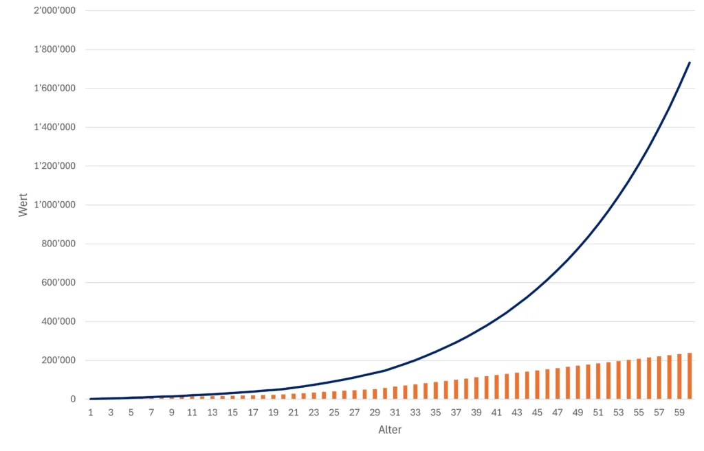 The real magic of compound interest is revealed when your child continues investing from age 30 to 60. By increasing their contributions to CHF 500 per month for the next 30 years, the account could grow to an astounding CHF 1.7 million by the time they reach 60. This is the transformative power of a long-term investment horizon combined with the discipline of dollar cost averaging (DCA), where fixed amounts are invested regularly, regardless of market conditions.