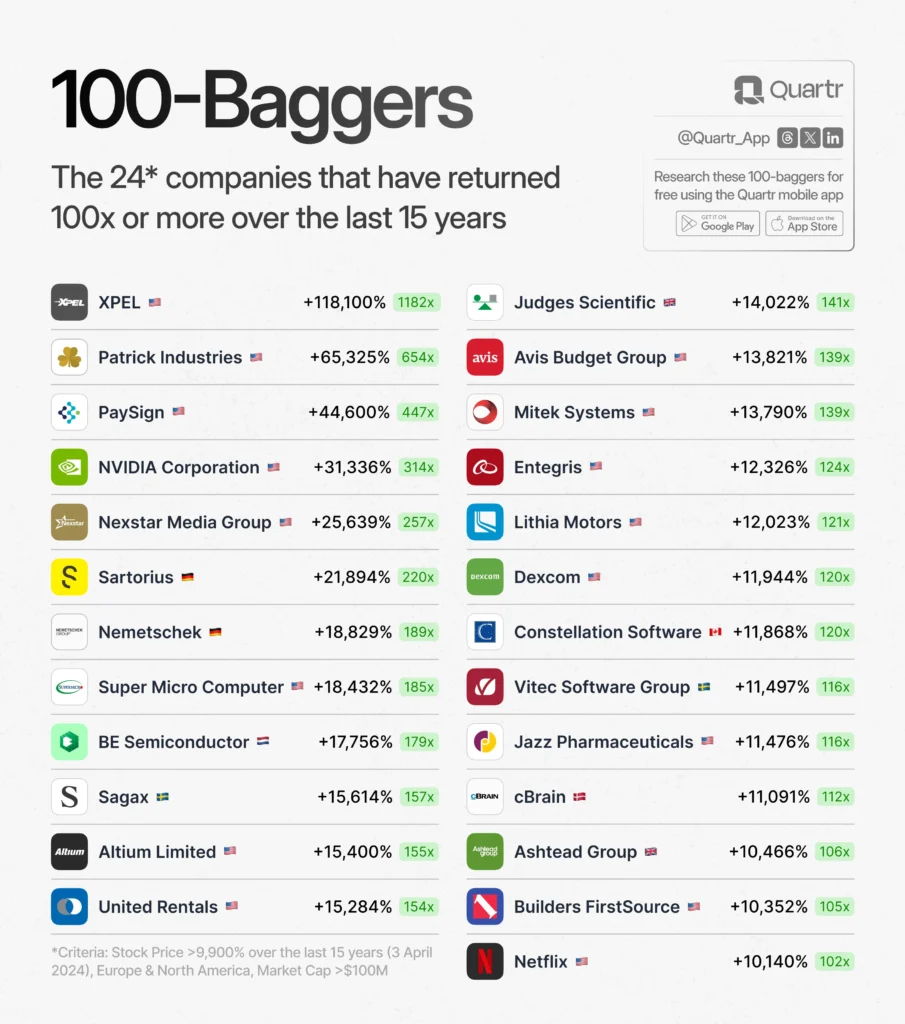 Chart 2: 24 companies that have returned 100x or more over the last 15 years