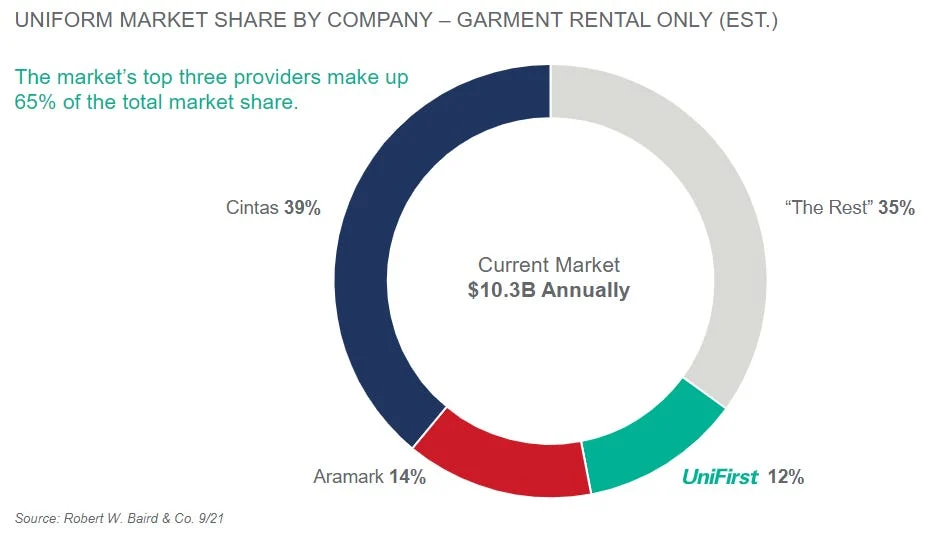 This isn’t just a niche practice. It’s a massive secular trend sweeping through businesses across every industry. And when it comes to outsourcing uniform rental and facility management in the US, there’s no bigger name than Cintas, which commands about 40% of the market share (chart 1). In Switzerland, the equivalent powerhouse is ISS, from Sursee Lucerne, a name you’re probably familiar with.