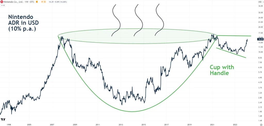 Nintendo has been forming a proven chart pattern for a decade now - one of the most common that has consistently produced impressive gains - the Cup with Handle.