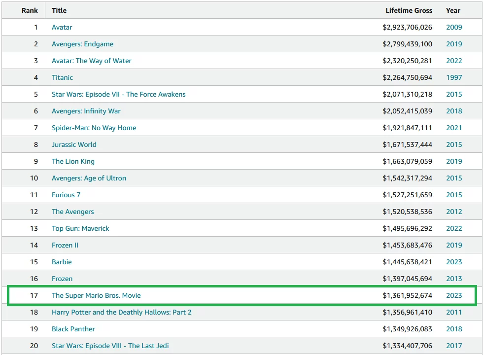 With its very first film, The Super Mario Bros. Movie, Nintendo has landed its first big hit outside the gaming industry. The film, which was released in cinemas at the beginning of April 2023, has grossed $1.4 bn worldwide, putting blockbusters such as Harry Potter and Lord of the Rings in the shade. This puts it in 17th place on Box Office Mojo’s list of top lifetime grosses (Chart 3).
