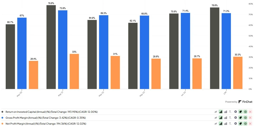 Over the last five years, management has delivered an average return on invested capital of 68%, while gross margins averaged 71% and net income margins stood at 31%.