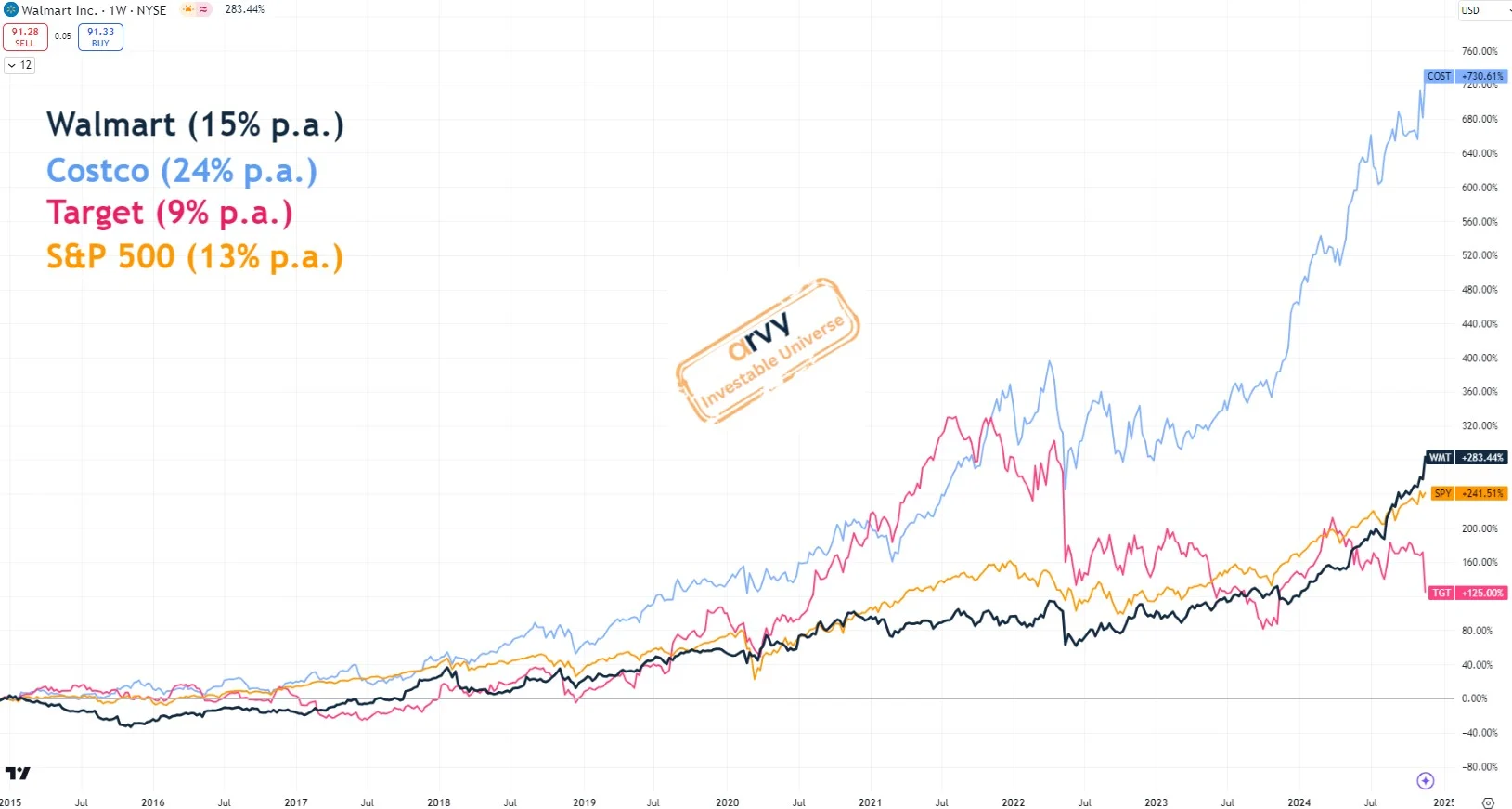 Namely Costco Wholesale, Target and Walmart. They belong to the mass merchandise segment (chart 2). The supermarkets for everyday needs.