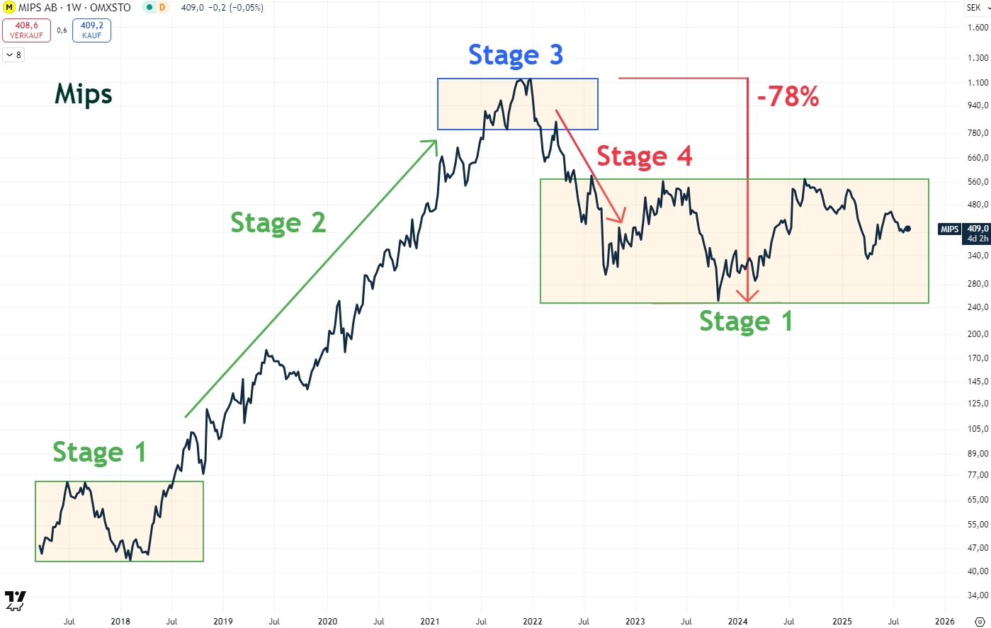 And here’s the painful part: once a stock enters Stage 4, the Declining Phase, history shows it on average corrects by 72% and takes about five years to recover.