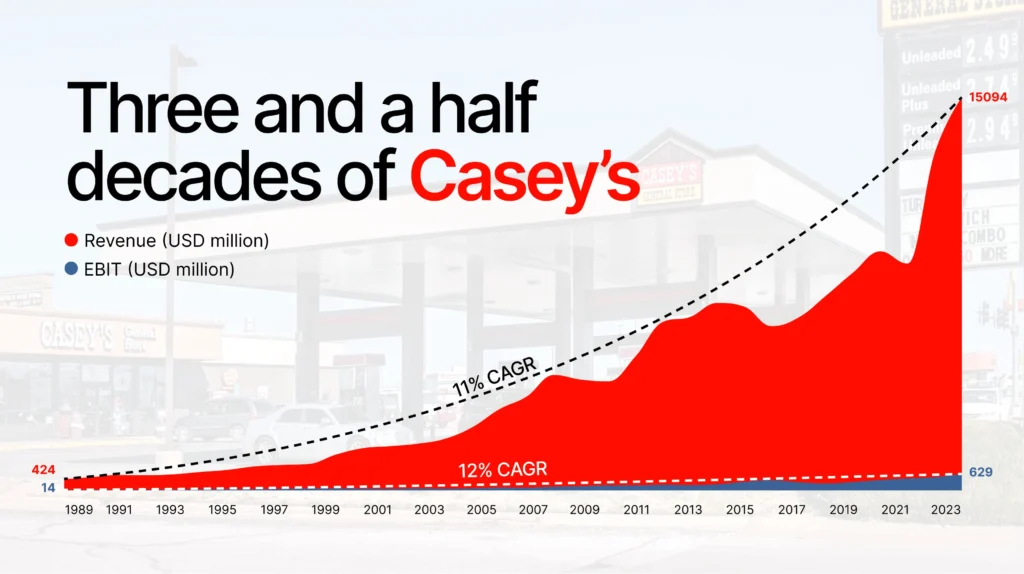 Chart 2: Casey’s revenue and EBIT (operating profit) growth over three and a half decades