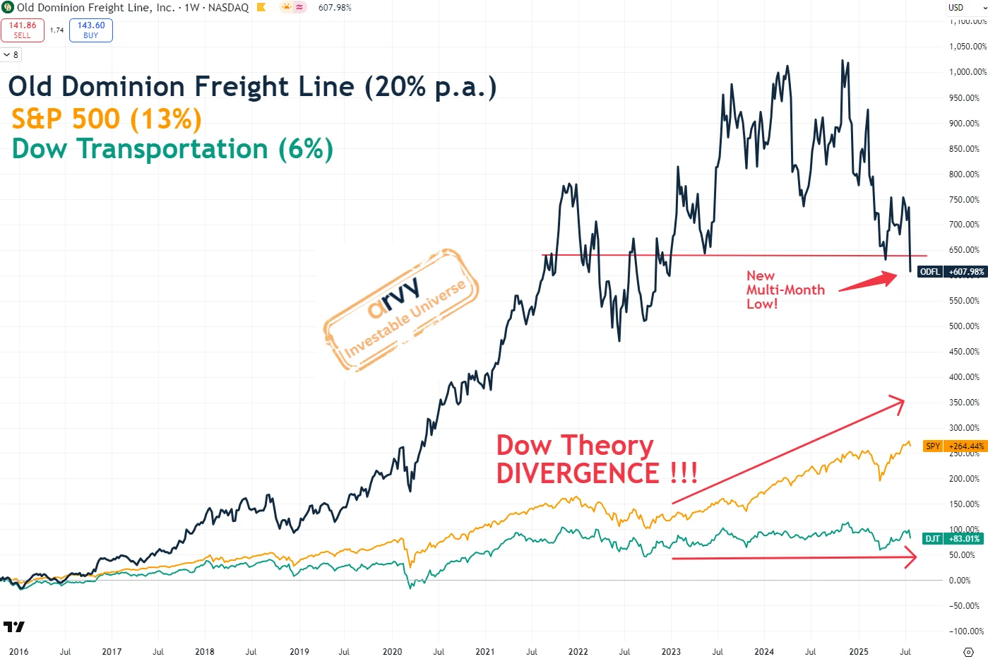 arvy's teaser: The market’s dancing on the rooftop — but the Dow Theory says the floor below is cracking. When the best trucking operator in America breaks down, it’s not just a stock story. It’s a classic signal. A serious one.