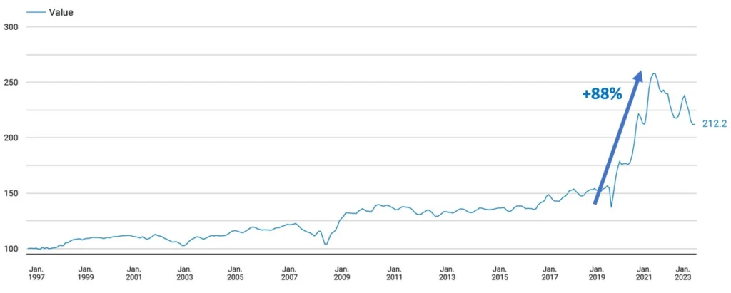 In particular, when you think of ordinary used cars. Yet, in the US, they performed virtually the same as the S&P 500 from the Covid lows in March 2020 to the peak.