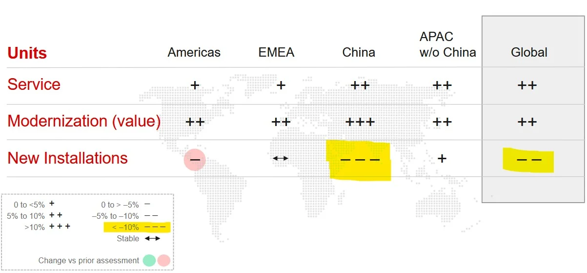 But there is a small light at the end of the tunnel. A structural upturn is forming, driven by secular tailwinds — the biggest being the need to modernize aging elevator infrastructure. Over 40% of the global installed base is now more than 15 years old.