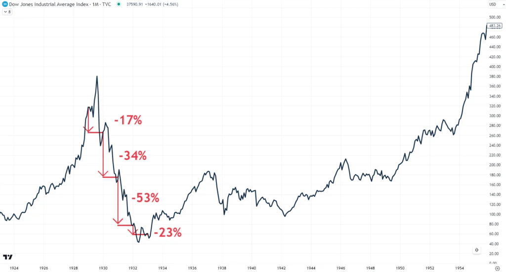 16. The Dow Jones lost 17% in 1929, 34% in 1930, 53% in 1931 and 23% in 1932.