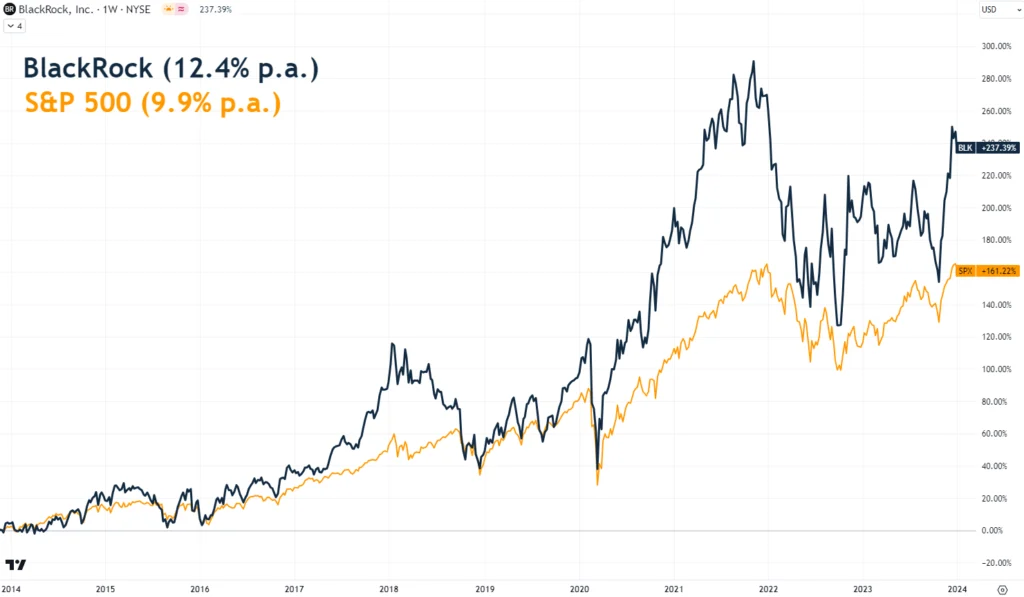 The US company has positioned itself well by focusing on being a passive investment business at its core, while also offering active strategies with investment managers who have established names, solid long-term performance and reasonable fees. In addition, Blackrock has built a strong brand identity with iShares in the ETF space and Aladdin, a data analytics tool for the institutional world.