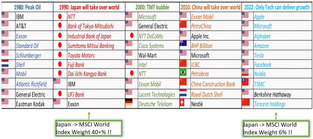 Below are the world's ten largest stocks by market capitalization at the start of each decade (chart 4). 1980/1990/2000/2010 and now 2022. The market always tells a story or follows a narrative. This is also the case with the AI hype now.
