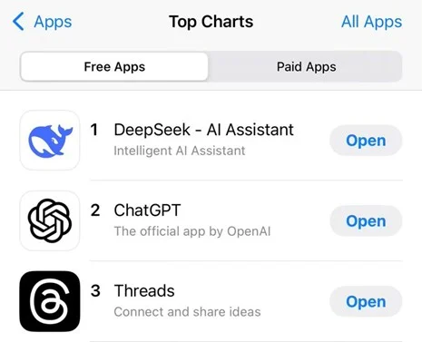 Chart 1: Top Charts, US App Store over the Weekend, 25/26th of January 2025