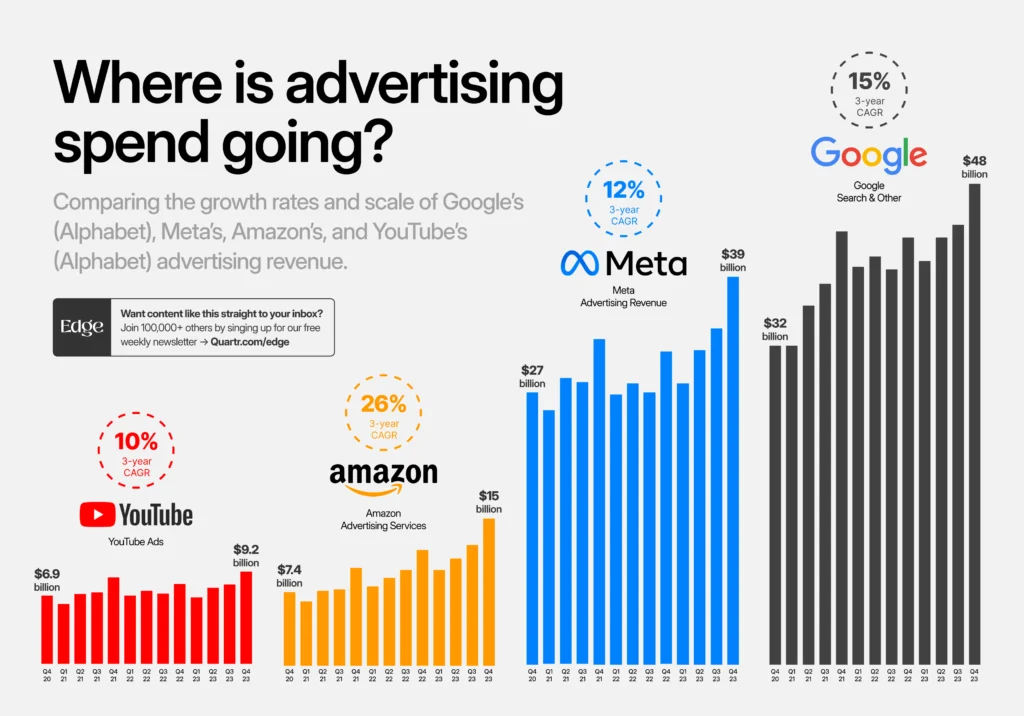 The advertising market is in the hands of a few very dominant players. Think about yourself: Where do you see most ads? When scrolling through social media (Meta), buying books (Amazon), watching videos (YouTube) or googling.