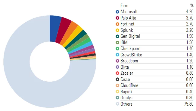 The 10 largest companies accounted for only 21% of the industry's total revenue in 2022. Palo Alto is the largest pure-play provider of cybersecurity solutions with 3.7% market share, putting it in second place behind Microsoft (4.2%).