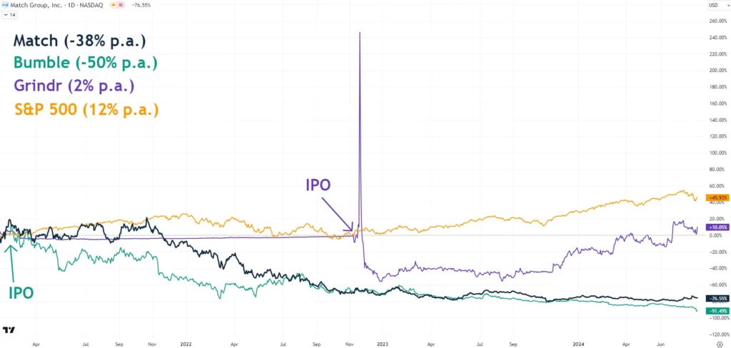 This makes it an attractive business model and has captured a lot of attention from investors in recent years. That is why Bumble (2021) and Grindr (2022) have also decided to go public alongside Match, which has been on the stock market for a while.