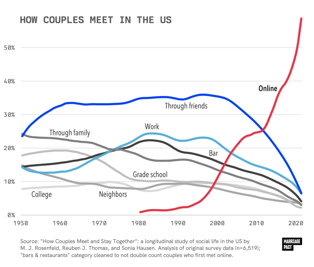 It is not as romantic as the Disney fairy tale or your beloved Hollywood romance. But it reflects today's world well because with the advent of the internet and technology, the way we interact with people has changed significantly, especially how we meet new people (chart 1).