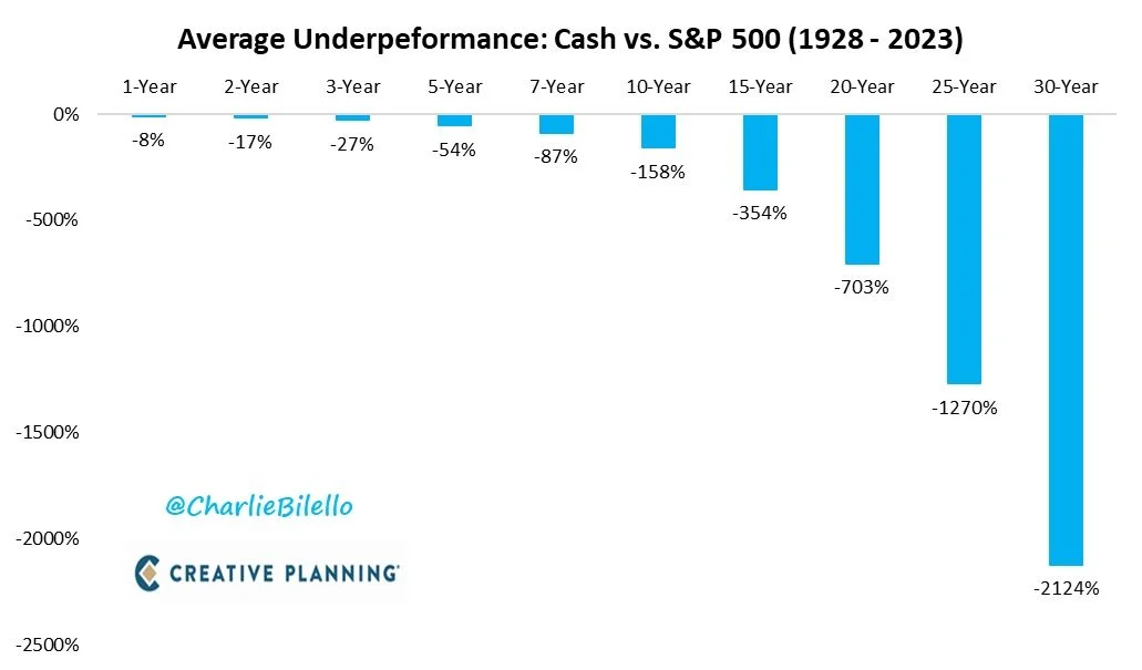Cash provides little to no returns, while the S&P 500 has delivered an average annual return of around 10% (before inflation). With dividends and price appreciation, the stock market allows wealth to grow significantly – an opportunity you forfeit by holding cash.