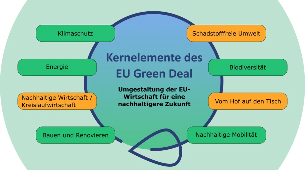 Im Rahmen des Grünen Deals sollen 1 Billion Euro investiert werden mit dem übergeordneten Ziel, die EU bis 2050 zum ersten "klimaneutralen Block" der Welt zu machen. Der Plan sieht vor, alle bestehenden Gesetze auf ihre Klimarelevanz zu überprüfen und neue Gesetze zu Kreislaufwirtschaft (Circular Economy), Gebäudesanierung, Biodiversität, Landwirtschaft und Innovation einzuführen.