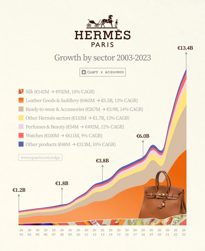 Almost everyone today associates the brand with its fashion and leather products, which now account for 70% of sales. However, it is not widely known that just three decades ago, "silk and textiles" accounted for 55% of sales, while leather goods contributed less than 10%.