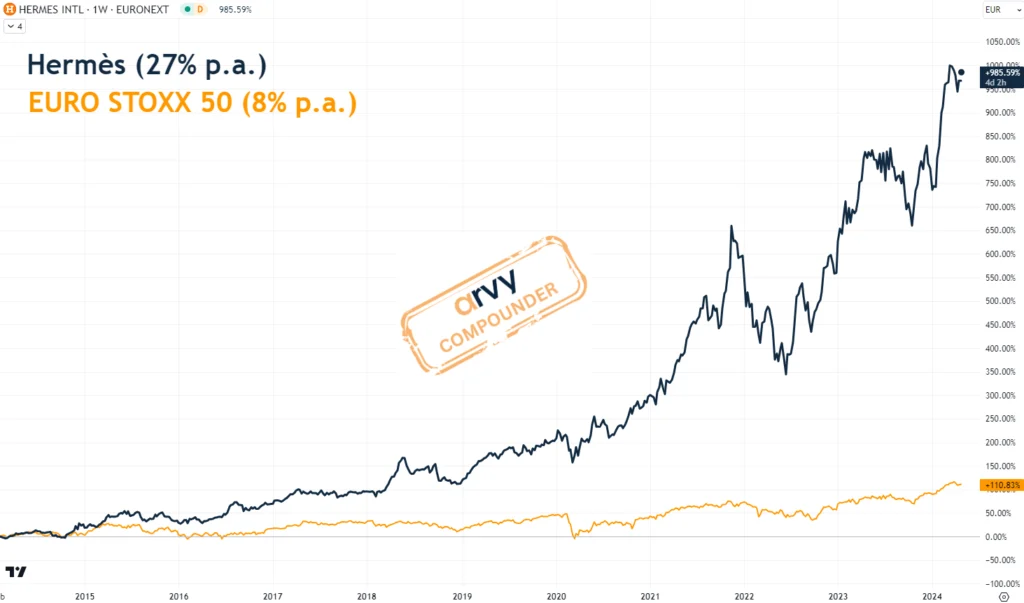 This is reflected in the resilience of Hermès - the customer does not care whether the bag costs €15,000 or €20,000. As long as they get one because it is exclusive. Despite being a fashion company, it is characterized by a stable and resilient business and share price development, such as in times of turbulence with DotCom, the Global Financial Crisis or Covid.