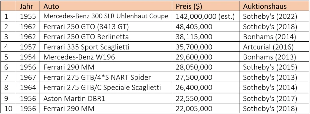 Chart 2: Most expensive cars ever sold at auction