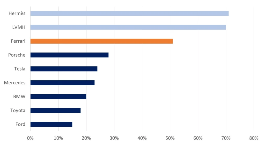 Ferrari generates gross profits outside the automotive sector. As mentioned, profitability is more comparable to that of a luxury goods manufacturer.