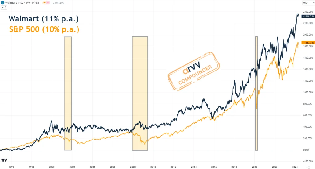 Chart 4: Walmart über 30 Jahre, US-Rezessionen (schattiert) mit starker Outperformance