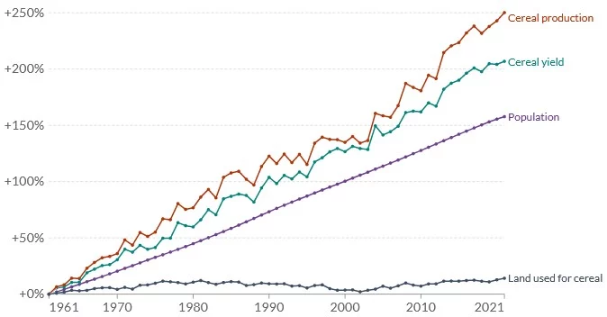 Abbildung 3: Veränderung von Getreideproduktion, Ertrag, Landnutzung und Bevölkerung